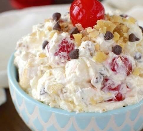 1 – Conservă de 20 uncii de ananas zdrobit (nu se scurge) 1 – Recipient de 8 uncii de Cool Whip (frisca) 1 cană de bezele mini 1/2 cană de nuci fin mărunțite + 2 linguri pentru garnitură 1/2 cană de feliuțe de ciocolată mini 2 banane coapte, feliate 1 – Borcan de 10 uncii de cireșe maraschino, tăiate în jumătate