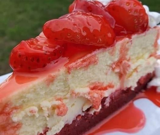 Base: Base de galletas con mantequilla, cheesecake de chocolate blanco con relleno de fresa, crema batida, más chocolate y aún más fresa. ¡La cheesecake de chocolate blanco y fresa más increíble!