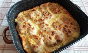 INGREDIENTE: 500 g de piept de pui 700 – 800 g de cartofi condimente uscate, piper 2 ouă 200 ml smântână acră 50 ml ulei 20 g unt