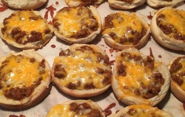 1 libra de carne molida 1/2 taza de pepperoni picado 1 lata de salsa de pizza 1 diente de ajo picado 1/2 taza de cebolla picada 1 taza de queso mozzarella rallado 1 cucharadita de condimento italiano 6 panes, divididos Utensilios: sartén y bandeja de horno