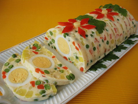 200 g mazăre congelată 200 g morcov 200 g cartofi 200 g mere 1 lămâie 6 linguri maioneză 7 linguri smântână acră 250 ml supă de legume 20 g gelatină 5 ouă 1 ardei roșu 1 legătură de pătrunjel piper sare