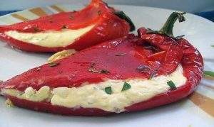 INGREDIENTE: 4-5 ardei roșii 1 ou 150 g brânză feta 2 linguri de smântână 1 lingură de pătrunjel tocat piper, sare
