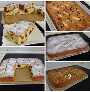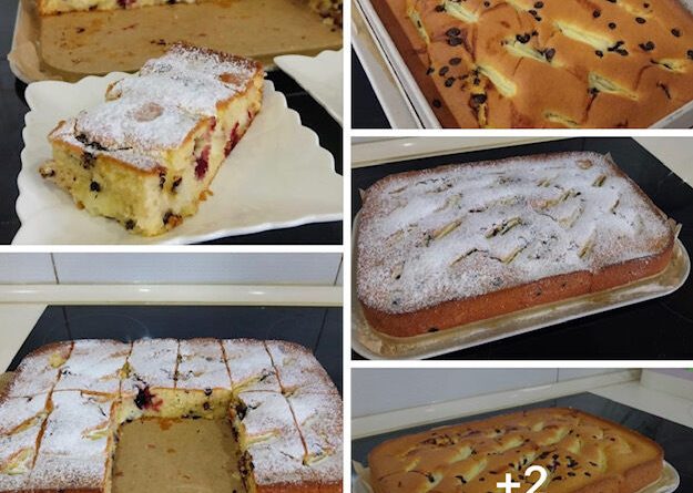 pentru aluat: 1 cană (200 ml) de zahăr, 4 ouă, 200 ml lapte cald, 180 ml ulei, 1,5 plicuri praf de copt, 2 linguri de făină de porumb, 2,5 cupe de făină. Plus: 1-2 mâini de vișine, 1-2 mâini de ciocolată fin tocată (picături). Se coace 30-35 de minute la 170 de grade. La final, pudrați cu zahăr după preferințe.