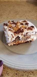 En fin, la cocina definitivamente iba a ser parte de mi futuro porque estaba rodeada de tantas mujeres que creían en cocinar para la familia, amigos, funciones de la iglesia y el vecindario. Sí… dije el vecindario… porque si no tenía nada que comer, sabía exactamente a qué casa ir para conseguir un plato caliente hecho con amor. Las variaciones de esta receta básica son infinitas. Puedes hacerla con una base de galleta con nueces pecanas o una base de pretzel, o usar pudín de butterscotch, pistacho o banana. Mira las muchas posibilidades a continuación de la receta.