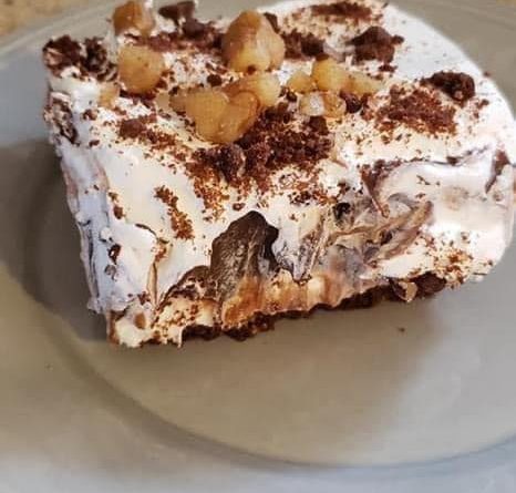 Chocolate Delight es un postre sencillo en capas que incluye una base de galleta con nueces pecanas, una capa de crema de queso estilo cheesecake y una capa de pudín de chocolate rico, todo ello coronado con crema batida y pecanas.