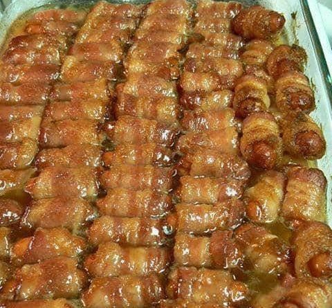 1 libra de tocino, cortado en tercios 1 libra de Lil’ Smokies (salchichas pequeñas) 1 barra de mantequilla 2 tazas de azúcar morena