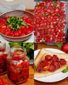 Prepararea roșiilor uscate în ulei implică uscarea roșiilor mari și cărnoase, cum ar fi cele San Marzano, la soare; totuși, acestea pot fi uscate și în cuptor, reducând timpul de preparare. În rețeta noastră am folosit roșii deja uscate, pentru a accelera prepararea. Apoi am aromezat roșiile uscate cu anșoa,