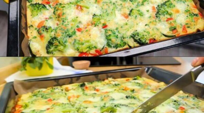 1 broccoli 1 dovlecel, tăiat în bucăți 1 morcov, curățat și tăiat 1 ardei gras, tăiat cuburi 1 ceapă, tocată mărunt 2 ouă 3 linguri de făină 220 ml de lapte 100 g mozzarella, tăiată cuburi 80 g cașcaval ras 2 linguri de ulei de măsline sare, piper negru și pătrunjel, după gust