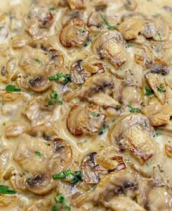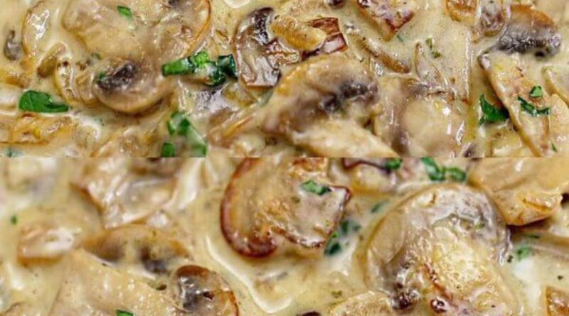 200 g ciuperci proaspete (șampinioni), jumătate de ceapă, puțin ulei vegetal pentru prăjit + 10 g unt, 150 ml supă sau apă, 100 g smântână lichidă neutru, puțină oregano, sare și piper negru după gust, 15 g parmezan ras, 1 cățel de usturoi și pătrunjel proaspăt