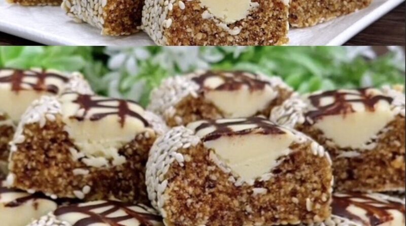 Amestecă arahidele cu pasta de curmale. Împarte compoziția în trei părți. Din fiecare parte modelează o ruladă și rostogolește-o prin susan.