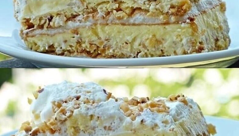 Aranjează desertul astfel: așază mai întâi foaia de bezea, apoi crema închisă la culoare, urmată de crema galbenă. Repetă stratificarea cu a doua foaie de bezea, crema închisă și crema galbenă, iar la final acoperă totul cu frișcă și presară nuci tocate grosier.