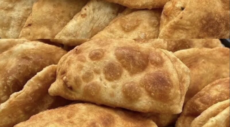 4. Pe o suprafață presărată cu făină, se întind bilele de aluat cu sucitorul, se adaugă umplutura, apoi se închid bine marginile, astfel încât să nu iasă umplutura în timpul prăjirii.