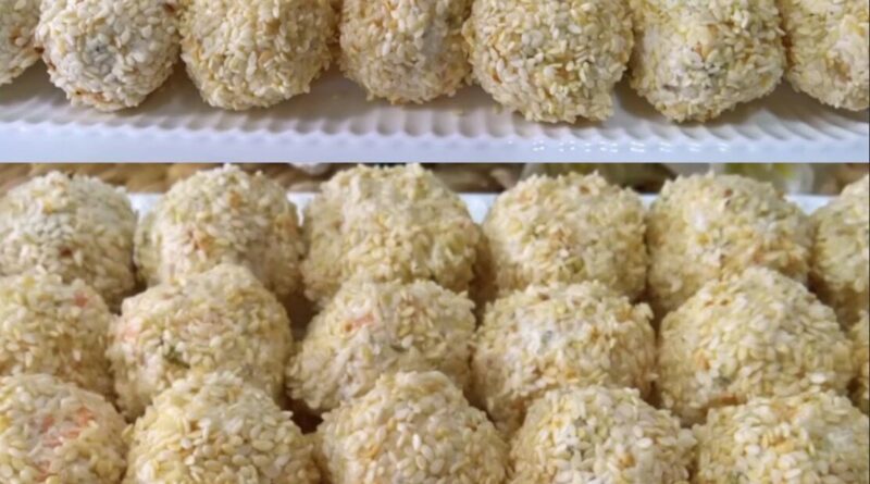 Formează biluțe din compoziție (aproximativ 25–30 bucăți, în funcție de mărime). Rulează fiecare biluță prin susanul prăjit, astfel încât să fie acoperită uniform.