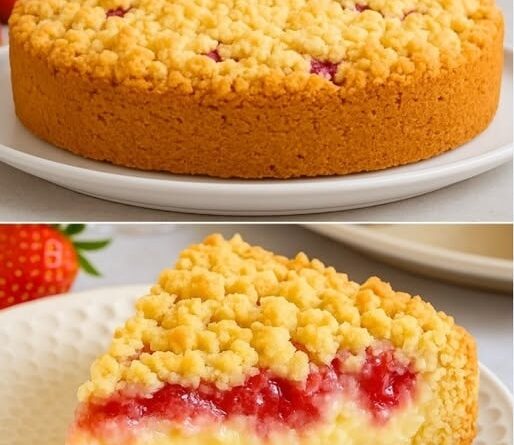 • Răspândiți crema rece peste aluat, apoi presărați căpșunile.