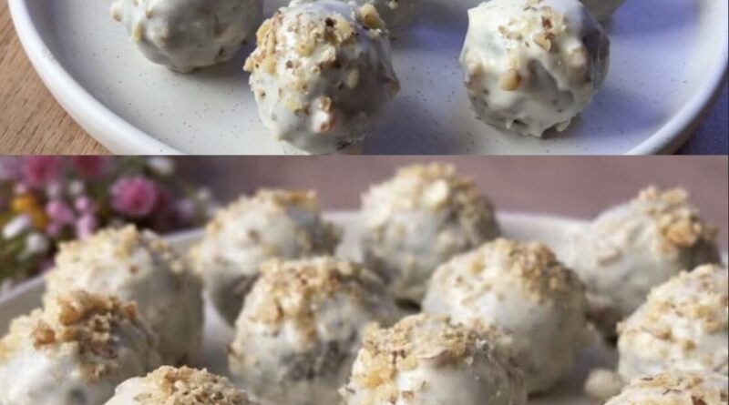 Imediat după ce ați scufundat biluțele în ciocolată, presărați deasupra nuci mărunțite fin. Acest pas adaugă textură și un aspect vizual plăcut, transformând biluțele într-un desert elegant, gata de servit.